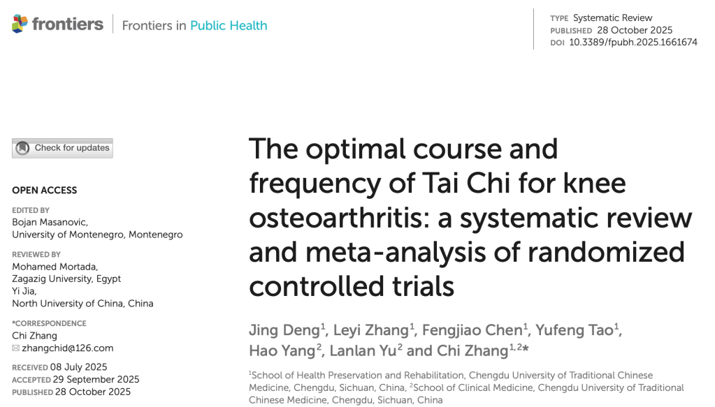 Este artigo buscou um total de 819 estudos e filtrou os 11 melhores para análise. O achado foi que o Tai Chi aumenta a circulação sanguínea no joelho e, junto com o bom controle respiratório, reduz níveis locais de fatores inflamatórios, como a interleucina 6 e o TNF alfa, reduzindo assim a dor inflamatória e a degeneração da cartilagem. Além disso, ele também modula a vida opióide descendente (responsável por inibir o sinal da dor para o cérebro)!