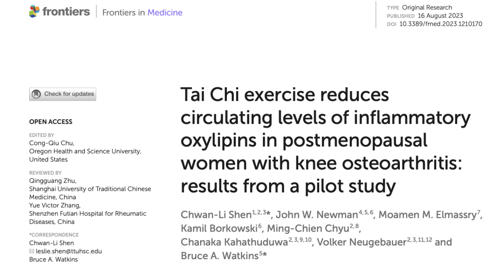 Esse último estudo que gostaria de anexar, é muito interessante pois os autores aqui dosam as taxas de inflamação (as chamadas OXILIPINAS) no sangue das pacientes na menopausa, entre 60-70 anos de idade, com artrose de joelho, antes e depois de terem feito o programa de treinamento com Tai Chi por médias de 8 semanas.