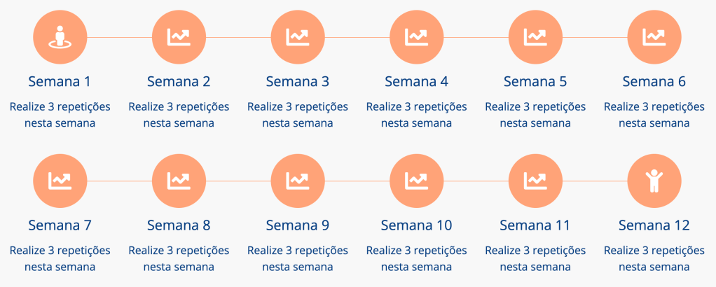 A cada semana vamos progredindo no programa e cada vídeo deve ser repetido 3x/semana. Quando clicar na semana em questão, abrirá um vídeo com uma senhorinha muito simpática, que vai nos ensinar como fazer os exercícios.